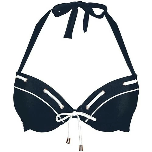 Haut de maillot de bain avec armatures coques push-up. Microfibre unie. Finition piping contrastée sur les bonnets. Jeu de laçage esprit marin avec oeillets métalliques. Nouage dans le cou et dans le dos. Médaille logotée BB sur le côté. Disponible du 85B au 95D. S’associe avec le slip HORIZON.