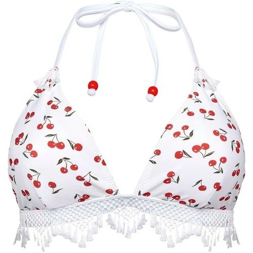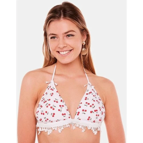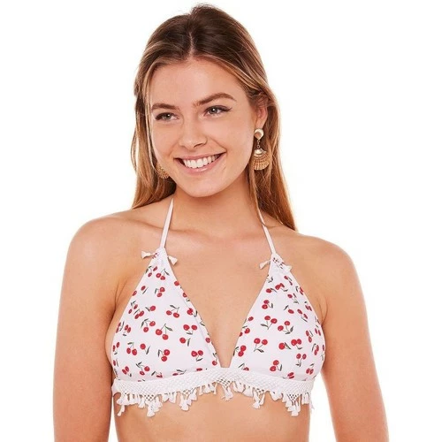Haut de maillot forme triangle en microfibre imprimée motif Cerises. Galon de guipûre à la basque. Nouage dans le cou et dans le dos. Finitions nouettes avec perles contrastées. Mousses bonnets amovibles. Médaille logotée BB sur le côté. Disponible du 36 au 42. S’associe avec le slip CERISIER