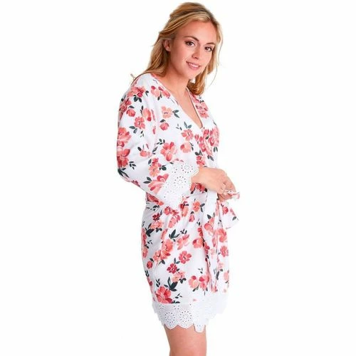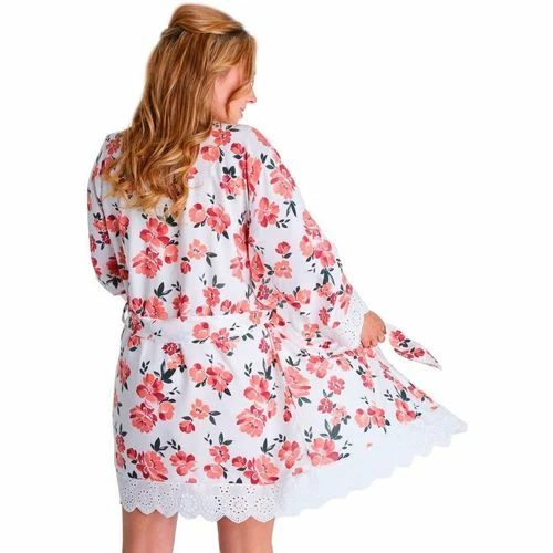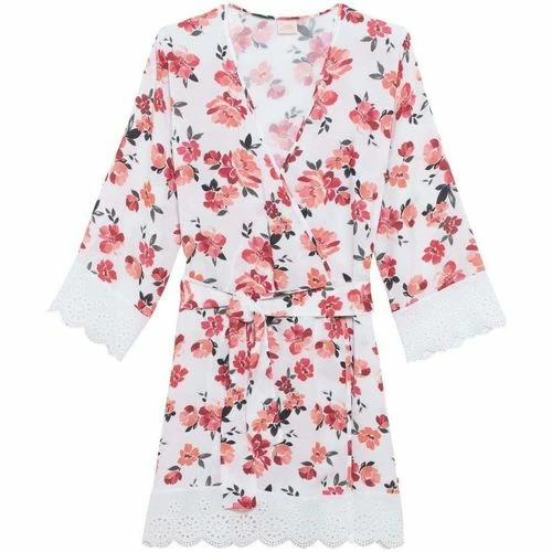 Kimono en viscose imprimée au motif « fleurs aquarellées ». Galon de guipure aux manches et bas de kimono. Ceinture à nouer. Disponible du 38/40 au 46/48