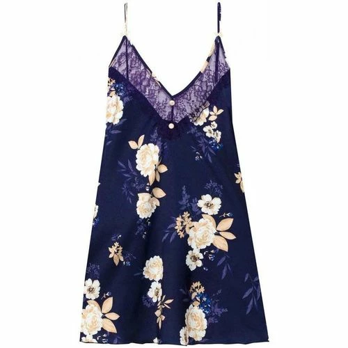 Nuisette en satin soyeux imprimé au motif fleurs d’antan. Dentelle fine au motif floral. Noeuds en satin contrastés aux départs des bretelles. Bretelles fines en satin. Dos échancré. Nouage dans le dos. Boutons en satin à l’entre-sein. Disponible du 38/40 au 46/48