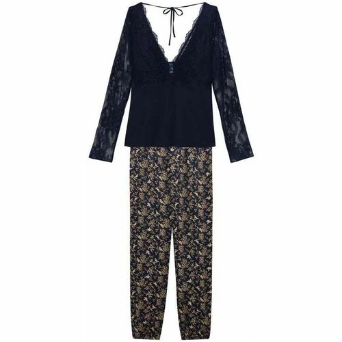 Top : Top manches longues en jersey viscose et dentelle fine. Décolleté plongeant. Bijoux mordorés à l’entre-seins. Ouverture dans le dos. Nouage dans le dos. Finition point bourdon. . Bas : Pantalon en satin imprimé au motif « tapisserie d’antan ». Finition avec élastiques aux chevilles. Disponible du 38/40 au 46/48