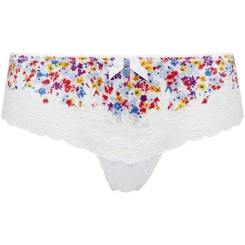 Shorty en dentelle d’antan imprimée au motif mini floral multicolore. Noeud contrasté et bijou émaillé. Tulle plumetis dans le dos. Fond doublé d’un gousset 100% coton. Disponible du 36 au 44