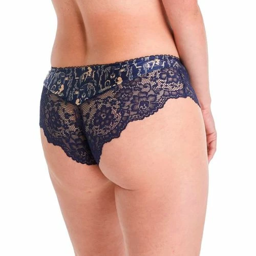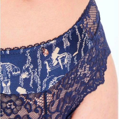 Shorty en microfibre imprimĂ©e au motif scĂ©nette d’antan. Maxi galon de dentelle esprit floral. Bijou strass Ă la ceinture. Fond doublĂ© d’un gousset 100% coton. Disponible du 36 au 44