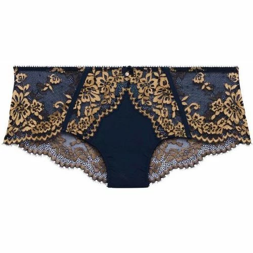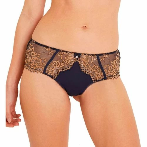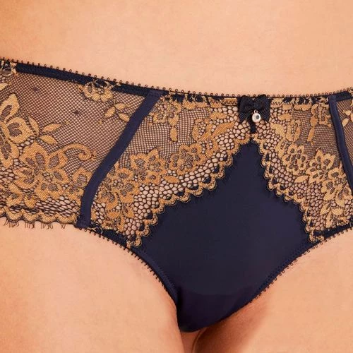 Shorty en dentelle florale bicolore effet de cils. Empiècements de tulle plumetis. Noeud gros grain et bijou strass à la ceinture. Ceinture élastiquée. Fond doublé d’un gousset 100% coton. Disponible du 38 au 50