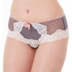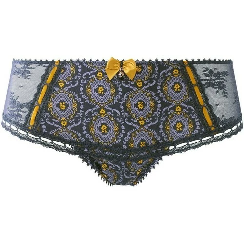Shorty string en dentelle all over. Imprimé micro satiné esprit tapisserie d’antan. Passe ruban contrasté. Nœud satiné contrasté associé à un bijou. Fond doublé d’un gousset 100% coton. Disponible du 36 au 46