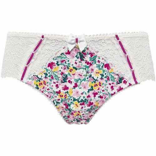 Shorty string en microfibre imprimée, motif Liberty multicolore. Dentelle florale esprit rétro. Galon de dentelle effet passe ruban et laminette contrastée à l’avant. Noeud gros-grain bicolore et bijoux mordorés à la ceinture. Elastique fantaisie effet picot. Fond doublé d’un gousset 100% coton. Disponible du 36 au 44.