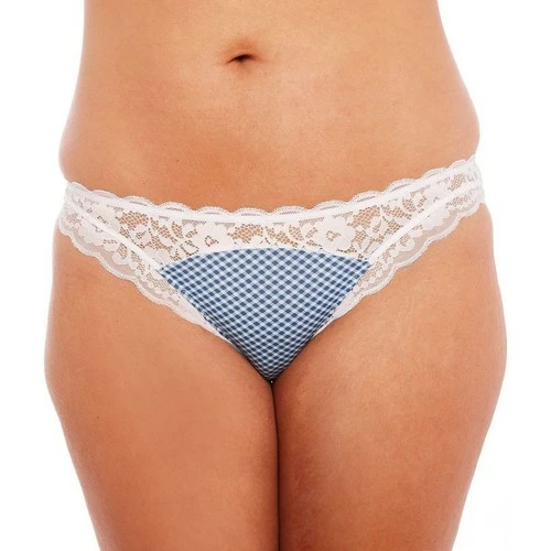 Slip en microfibre imprimée au motif Vichy. Bande de dentelle florale texturée petite écaille. Noeud satiné en dentelle à la ceinture. Nœud satiné et finition fronçée dans le dos. Disponible du 38 au 50
