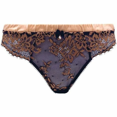 Slip en dentelle florale bicolore effet de cils. Empiècements de tulle plumetis. Noeud gros grain et bijou strass à la ceinture. Ceinture élastiquée recouverte de satin plissé. Fond doublé d’un gousset 100% coton. Disponible du 36 au 44