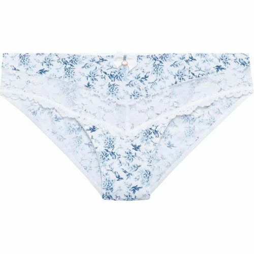 Slip en microfibre imprimée au motif toile de jouy revisitée. Maxi galon de dentelle florale. Noeud gros-grain et bijou émaillé à la ceinture. Fond doublé d’un gousset 100% coton. Disponible du 38 au 50
