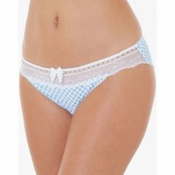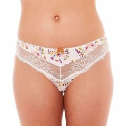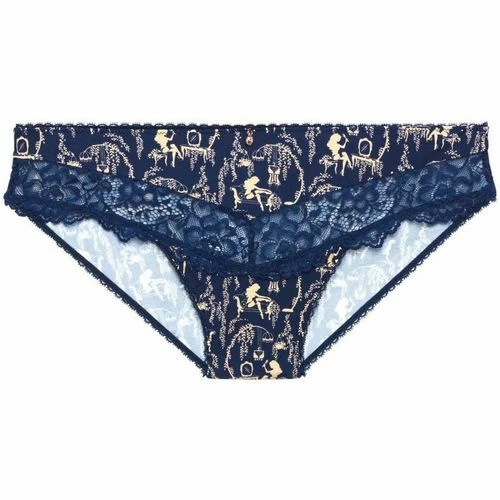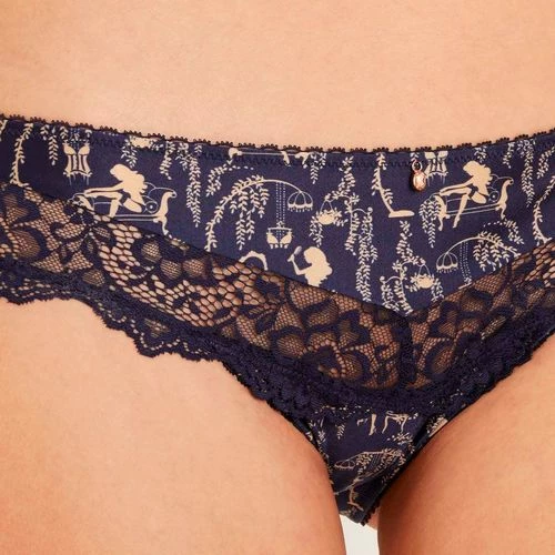 Slip en microfibre imprimée au motif scénette d’antan. Maxi galon de dentelle esprit floral. Bijou strass à la ceinture. Fond doublé d’un gousset 100% coton. Disponible du 38 au 50