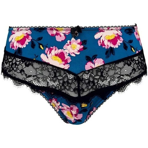 Slip en microfibre satinée imprimée au motif maxi floral. Dentelle d’antan effet de cil. Noeud gros-grain et bijou mordoré à la ceinture élastiquée. Fond doublé d’un gousset 100% coton. Disponible du 38 au 50