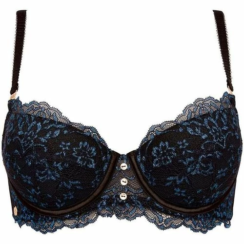 Soutien gorge armatures coques. Décolleté classique. Dentelle d’antan florale avec fil métallisé contrasté. Cache armatures habillé de satin. Boutons et bijoux mordorés à l’entre-seins. Bretelles fantaisies fines réglables. Ailes en tulle plumetis. Basque élastiquée en dentelle d’antan grande écaille. Médaillon siglés BB sur l’aile. Fermeture 2 agrafes, 3 positions. Disponible du 85B au 95C