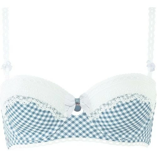 Soutien gorge armatures coques forme foulard. Décolleté classique. Dentelle motif marguerite, imprimé Vichy. Ailes en tulle plumetis. Noeud bicolore et bijou coloré à l’entre-seins. Bretelles fines réglables. Médaillon siglé BB sur l’aile. Fermeture 2 agrafes, 3 positions. Disponible du 85B au 95C.