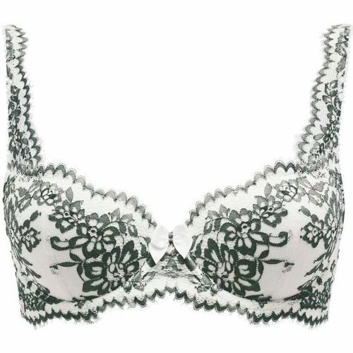Soutien gorge armatures coques. Décolleté classique. Dentelle bicolore florale effet de cil. Tulle plumetis sur les ailes. Noeud gros-grain et strass à l’entre-bonnets. Bretelles en dentelle réglables. Médaillon siglé BB sur l’aile. Fermeture 2 agrafes, 3 positions. Disponible du 85B au 95C