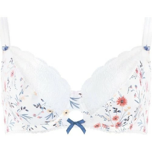 Soutien-gorge armatures. Microfibre satinée imprimée rétro floral. Large galon en dentelle délicate. Nœud en organza contrasté. Petits nœuds aux départs de bretelles. Fermeture 3 agrafes, 3 positions. Disponible du 90D au 105E