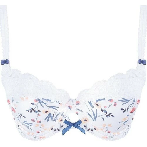 Soutien-gorge coques moulées. Microfibre satinée imprimée rétro floral. Large galon en dentelle délicate. Nœud en organza contrasté. Petits nœuds aux départs de bretelles. Fermeture 2 agrafes, 3 positions. Disponible du 85B au 95C