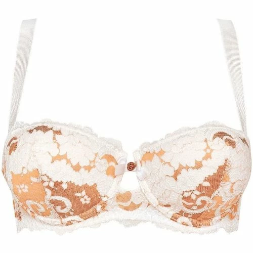 Soutien gorge armatures coques forme bandeau. Décolleté classique. Dentelle florale bicolore effet cuivré. Noeud avec fleur satinée à l’entre-seins. Ailes en tulle plumetis. Larges bretelles fantaisies réglables. Basque élastiquée sous poitrine. Médaillon siglé BB. Fermeture 2 agrafes, 3 positions. Disponible du 85B au 95C