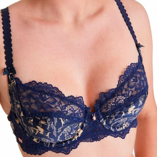 Soutien gorge armatures. Décolleté classique. Forme emboitante. Microfibre imprimée au motif scénette d’antan. Maxi galon de dentelle esprit floral. Bijou strass à l’entre-bonnets. Bretelles plates fantaisie fines et réglables. Noeud gros grain aux départs de bretelles. Basque sous poitrine élastiquée fantaisie effet picot. Médaillon siglé BB sur l’aile. Fermeture 2 agrafes, 3 positions. Disponible du 90B au 95D