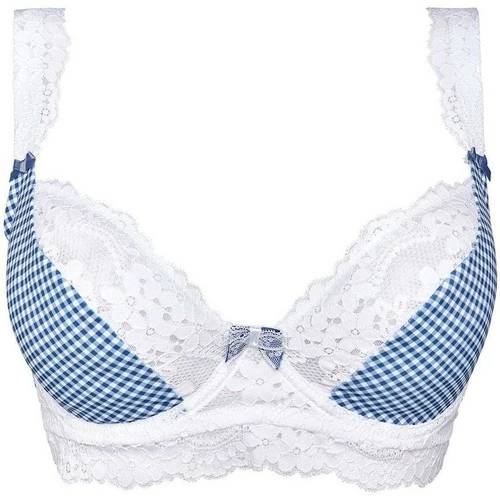 Soutien gorge armatures grand maintien. Microfibre imprimée au motif Vichy. Bande de dentelle florale texturée petite écaille. Noeud satiné en dentelle à l’entre-seins. Doublure bonnet douce et rigide. Finition dos cheminée. Forme emboitante. Noeuds satin aux départs des bretelles larges réglables. Basque élastiquée sous poitrine. Médaillon siglé BB. Fermeture 3 agrafes, 3 positions. Disponible du 95C au 105E