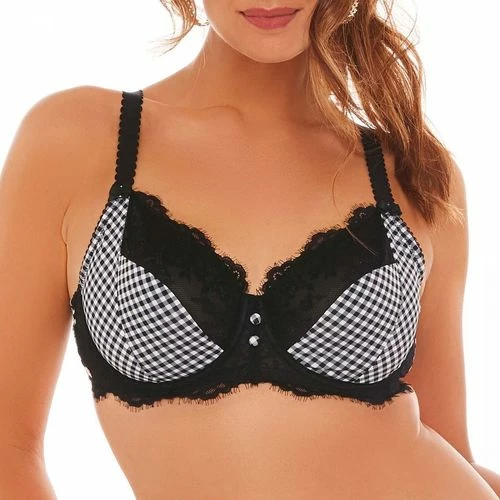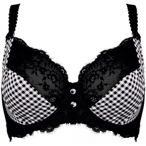 Soutien gorge armatures grand maintien. Décolleté classique. Forme emboitante. Microfibre imprimée au motif Vichy. Dentelle d’antan effet de cil. Doublure bonnets douce et rigide. Boutons imprimés à l’entre-seins. Noeuds gros grain aux départs de bretelles . Bretelles fantaisies larges réglables. Médaillon siglé BB sur l’aile. Fermeture 3 agrafes, 3 positions. Disponible du 95C au 105E