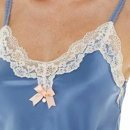 Top short en satin. Large galon de dentelle. Nœud satiné contrasté associé à un bijou au niveau du décolleté. Nœud satiné contrasté de chaque côté du short. Détail ouverture dans le dos. Disponible du 38/40 au 46/48